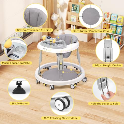 Baby Walker, Foldable Multi-Function Anti-Rollover Walker with Music Tray & Light, 7 Level Height Adjustable, Baby Walkers for 1 Year Olds Suitable for All Terrains (Grey)