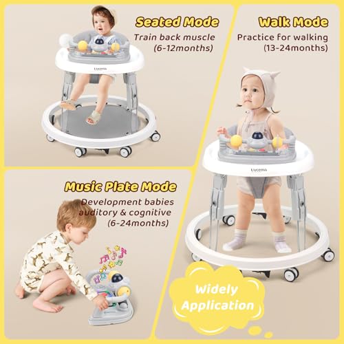 - Baby Walker with Interactive Activity Center: Boasting a removable interactive music tray with playing melodies, light, steering wheel and rotatory toys, the sit to stand walker can satisfy your baby's curiosity for early learning and playing. When your baby needs a meal, you can remove the musical tray to turn it into a tray for meals
