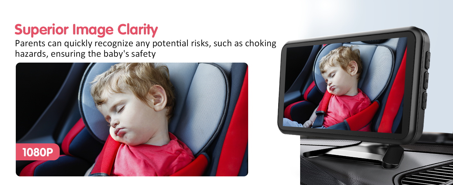 - 1080P HD Display: Drive confidently with a 5.2" 1080P baby camera for car that delivers sharp, clear visuals without taking up too much dashboard space. This car baby monitor shows every detail of your baby' s movement, helping you stay focused while keeping an eye on the back seat.