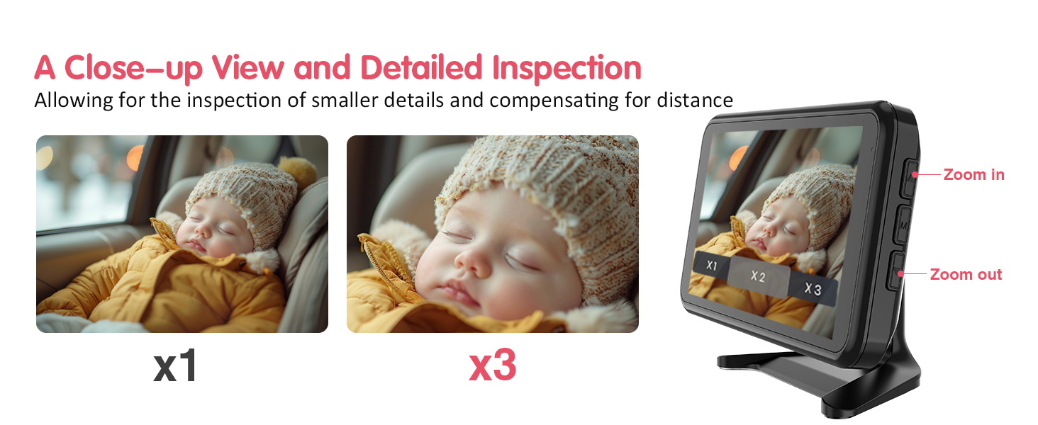 - 3X Zoom Clarity: Stay focused while driving, with a powerful car seat camera for baby rear facing that features 3X zoom for real-time close-ups. This baby car camera captures every tiny yawn, stretch, or smile—so you never miss a moment on the road.