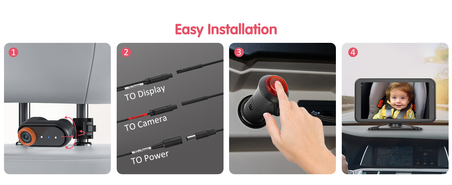 - Easy 3-Step Setup: Install your car baby monitor with camera in just minutes—no tools needed. Simply mount the bracket, connect the cable, then plug it in. This baby camera car is perfect for busy parents who want quick, reliable setup on the go.