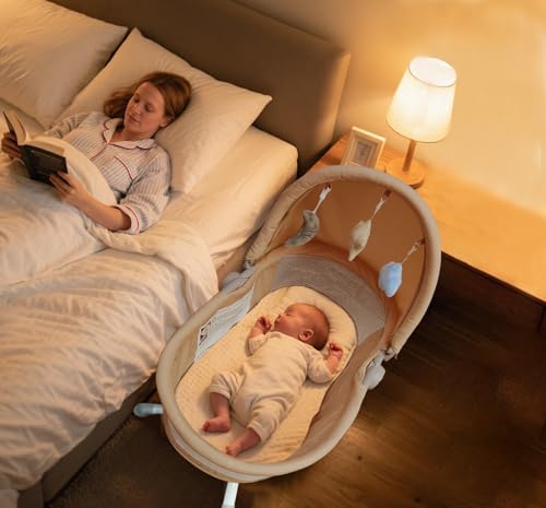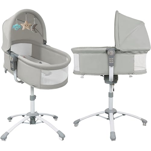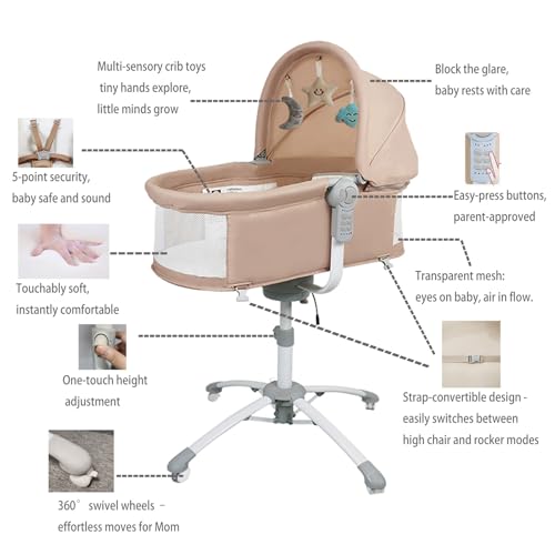 - 【Multifunctional 3-in-1 Design】 This next to me crib transforms from a sleep bed to a comfortable rocking seat and a convenient high chair – three baby products in one with multiple functions. The convertible design can adapt to the various development stages of your baby. This baby crib is also height adjustable, and has a sturdy frame and 360° swivel wheels, and can be folded to save storage space.