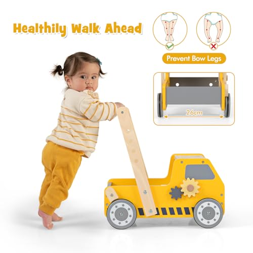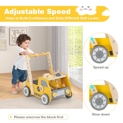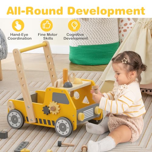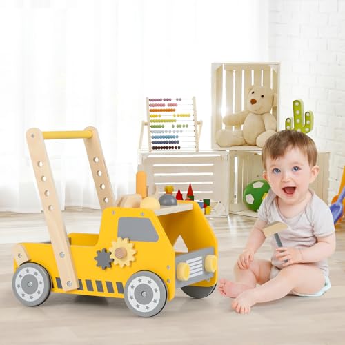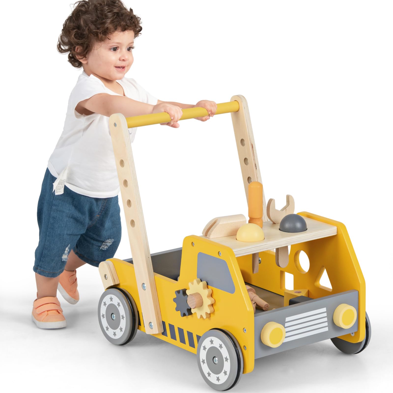 - Learn & Play: Including a 21 pcs fun tool kit, the montessori-inspired push walker doubles as a tool bench for toddlers. Watch as your little ones become ace engineers, shape matching, turning gears, hammering nails, twisting screws and using wrench to their hearts’ content.