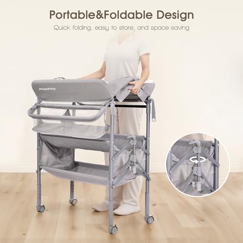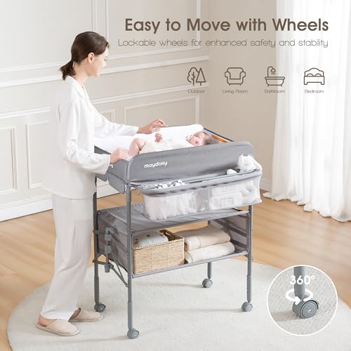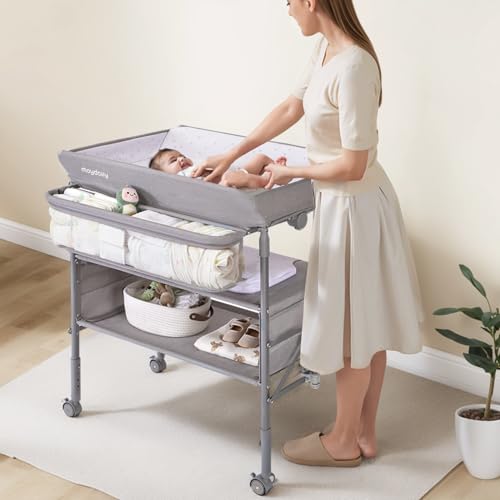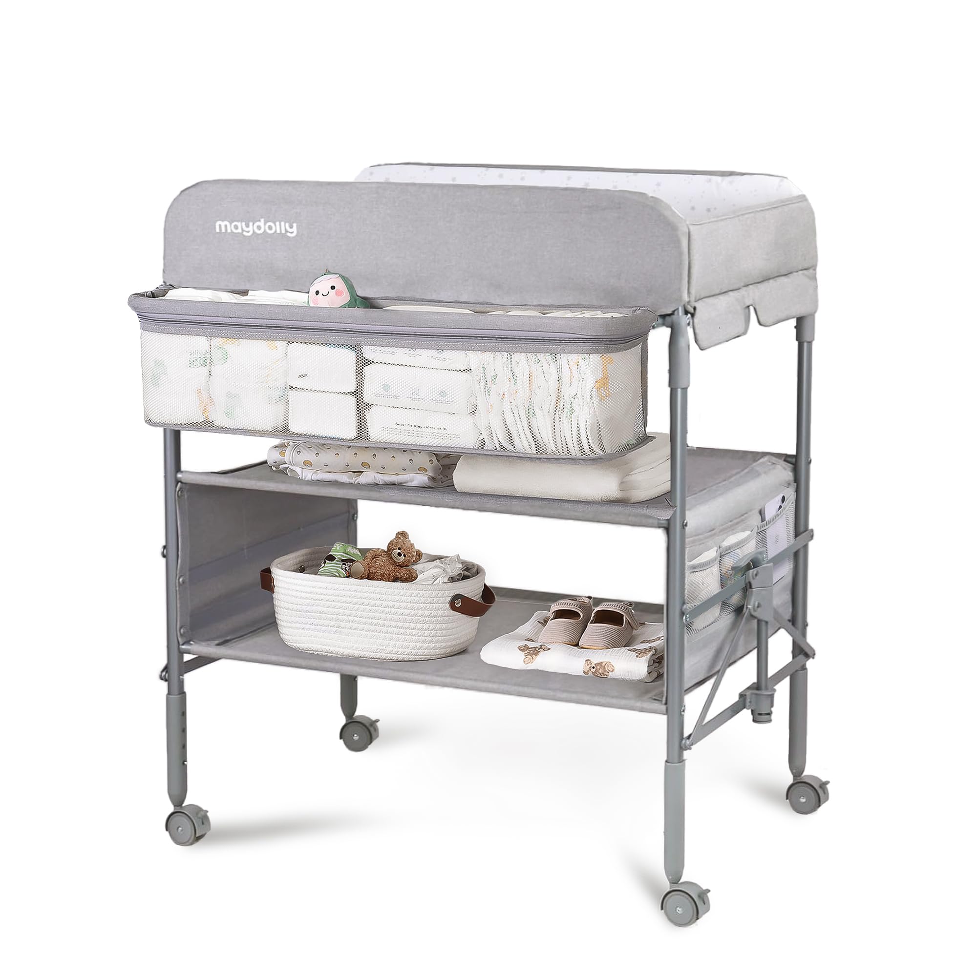Maydolly Baby Changing Table, Portable Foldable Changing Station with Wheels, Waterproof Surface, Adjustable Height Baby Changing Unit with Storage Rack for Newborn (Grey)