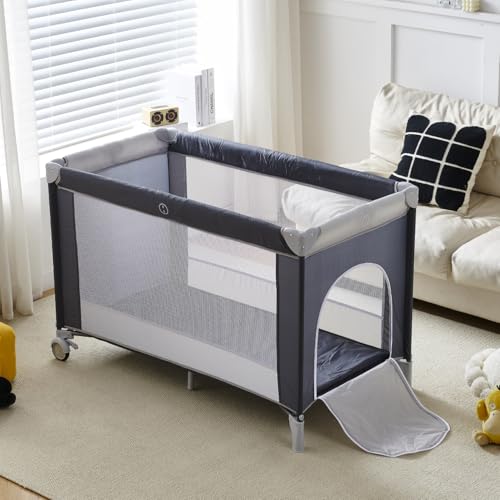 - Travel Crib and Playpen: Portable travel cot suitable for babies and toddlers aged 0-3 years, featuring lockable wheels for easy mobility and a convenient side entrance
