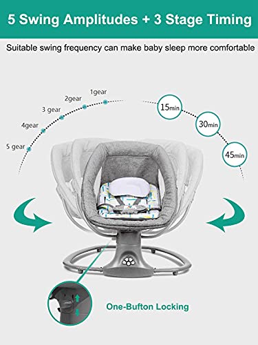 - 【Multiple Adjustable Modes and Functions】 This bedside crib has three timing modes, 15, 30 and 45 minutes, you can set the appropriate time according to your and your baby's needs. This crib also has five swinging gears to meet the needs of babies of all physiques. Let your baby find the most suitable swing amplitude and frequency, and then fall asleep peacefully in the arms of a mother.