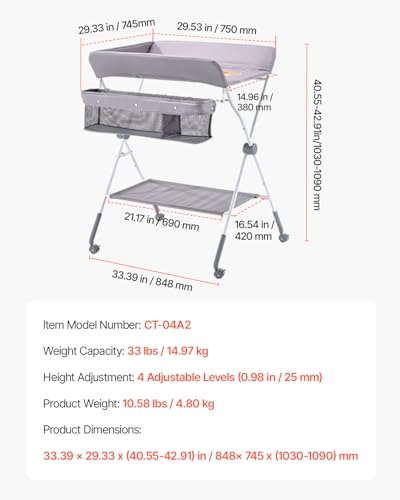 VEVOR Baby Changing Table, Foldable Diaper Change Station with Side Basket, Adjustable Height Portable Changing Table with Lockable Wheels, Multi-Functional Storage Organizer Nursery, Light Gray