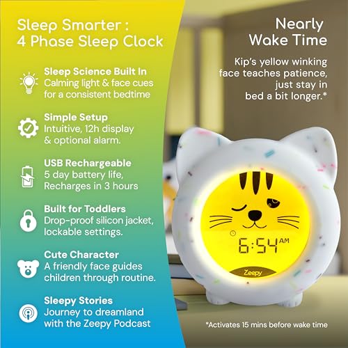 Zeepy 4-Phase Toddler Sleep Trainer Clock | USB Rechargeable Cute Kids Alarm Clock | Drop Proof Baby Night Light | Science-Backed For Better Bedtime Routines – Kip the Kitty