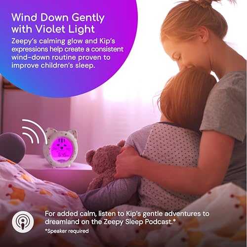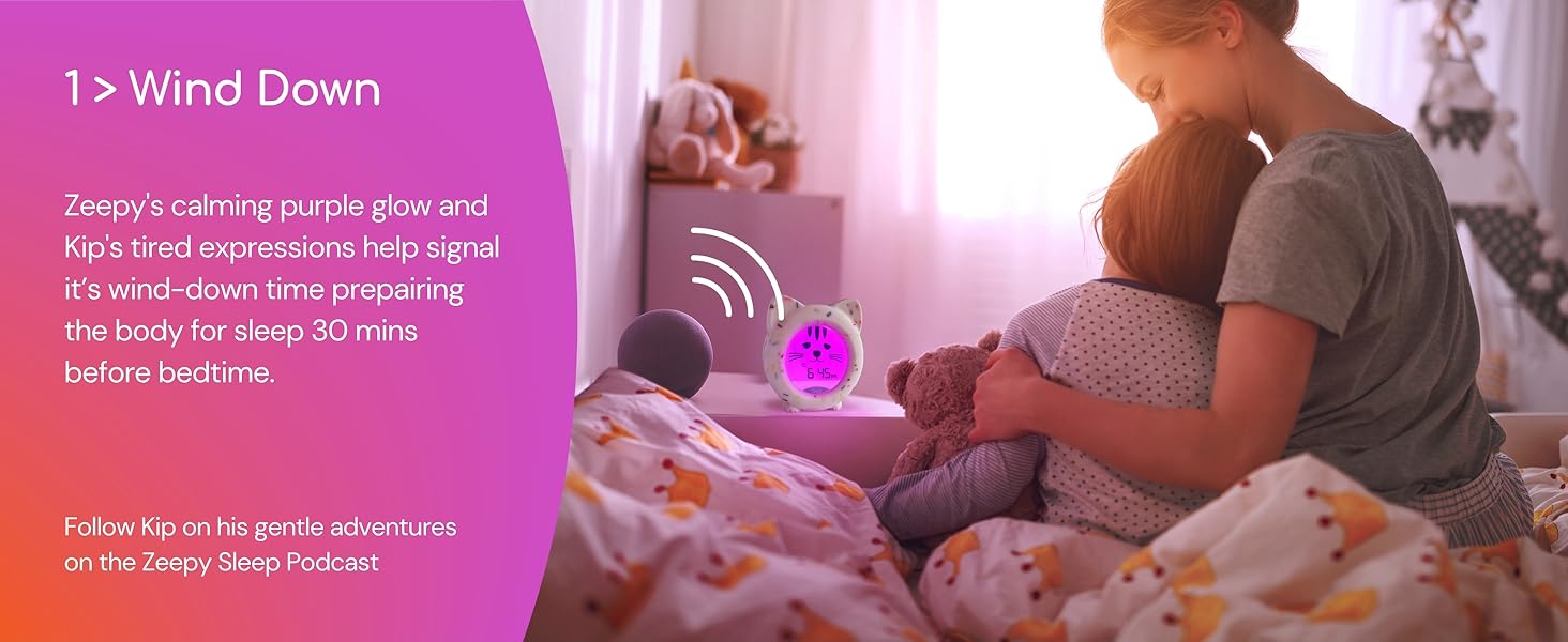 - Wind-Down = Violet Light and Kip's tired face help establish a peaceful pre-bed routine, proven to improve children’s sleep. Our toddler clock can be used with the Zeepy Sleep Podcast, calming bedtime stories with Kip the cat.