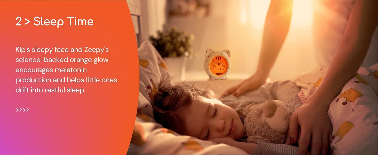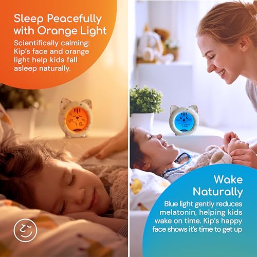 - Sleep Time = Orange Light and Kip’s sleeping face make sleep training easy. A baby night light and kids digital clock that supports melatonin production and gently lulls your child to sleep.