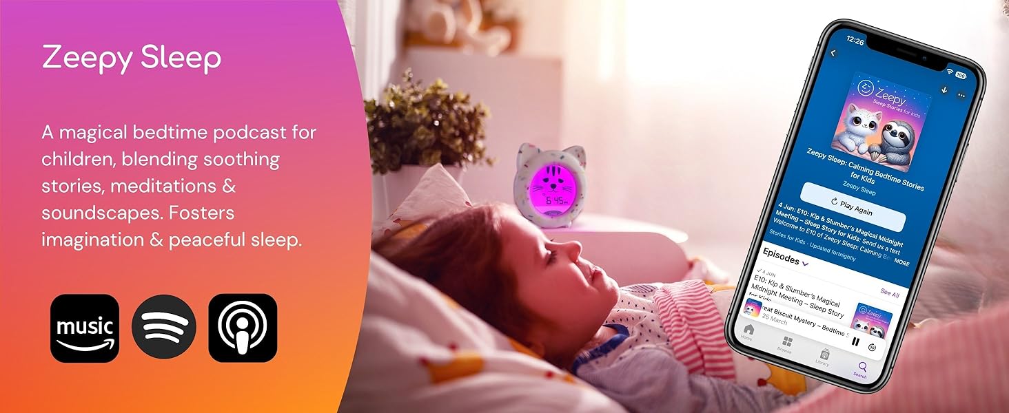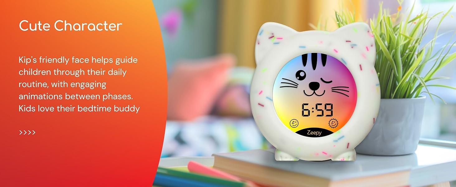 Designed to grow with your child, Zeepy begins as a soft night light for baby night feeds, then becomes a fun and functional toddler clock for sleep training. Kip the Kitty’s animated face changes with each phase, giving children clear visual cues they can follow with confidence.