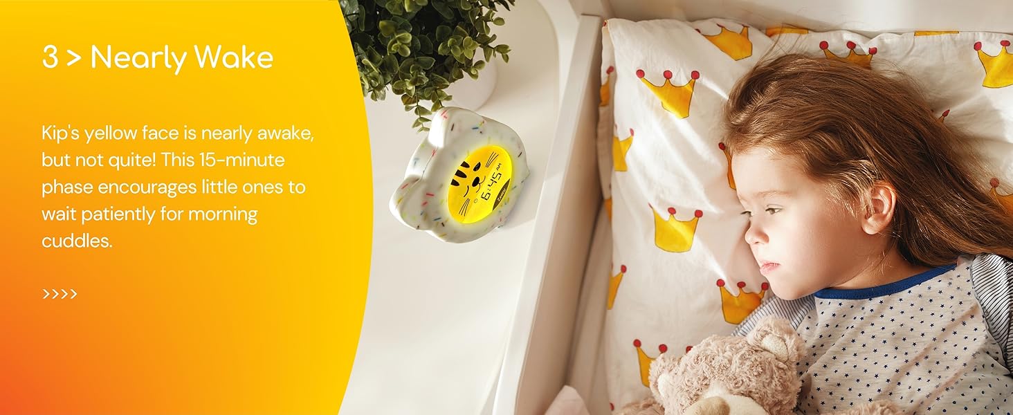 Yellow Nearly Wake: Kip winks with yellow glow, teaching early risers patience & helping parents rest longer.