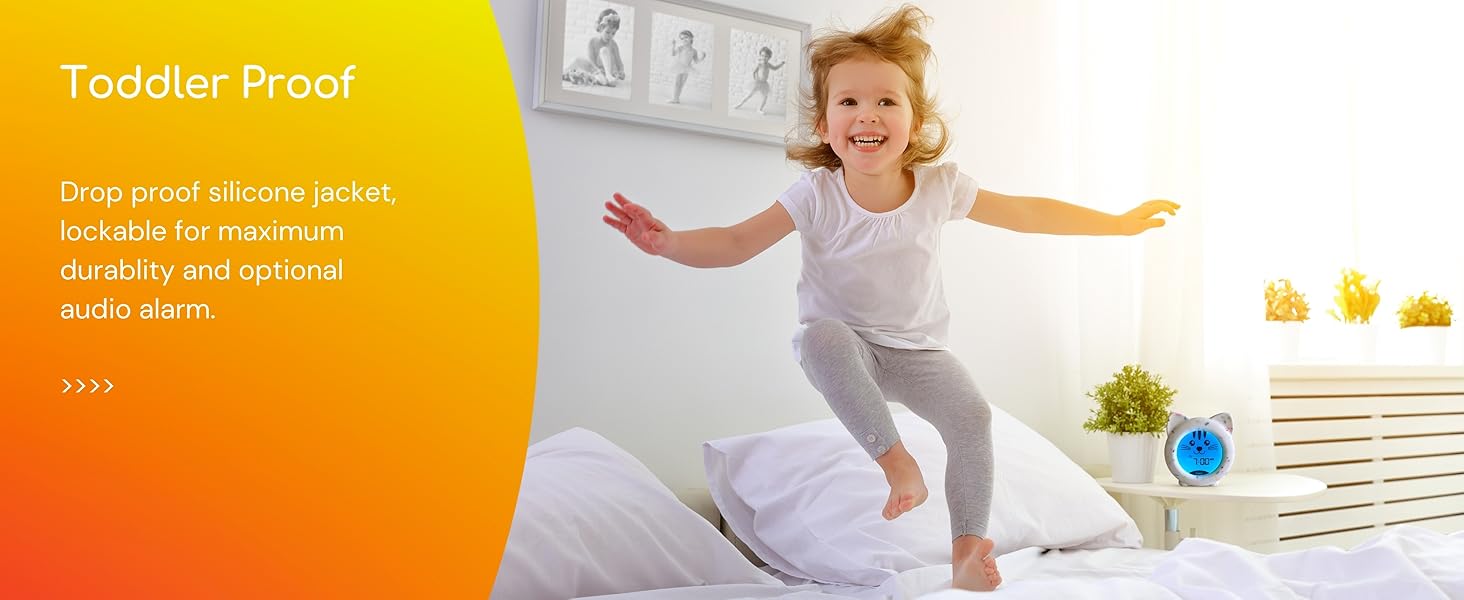 - Nearly Wake = Yellow Light and a Winking face give children a visual cue to stay in their toddler bed just a little longer, an alarm clock for kids, teaching patience and helps parents get more rest.