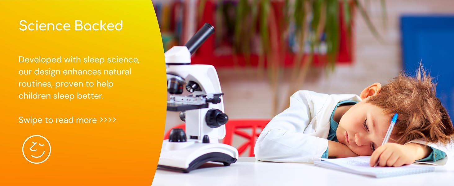 Amber Sleep: Kip slumbers with amber light, scientifically supporting melatonin for deep, restful sleep in your toddler bed.