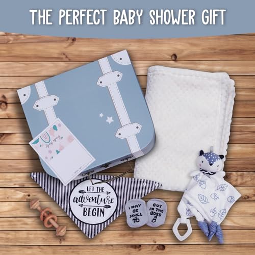 - ✔️ BABY GIFT WITH ALL THE ESSENTIALS – This gift box for baby shower comes with cute and practical newborn essentials that make the maternity journey more beautiful and fun! The set includes 1 x baby blanket, 1 x baby security blanket, 1 x wooden rattle toy, 1 x baby bib, 1 x pair of funny baby socks and 1 x greetings card.