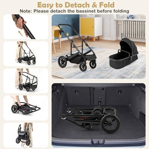 - 【Easy to Detach & Fold】Featuring a detachable bassinet for independent use and a foldable lightweight and sturdy aluminum frame, this baby buggy combines convenience with portability, simplifying storage and transport. Note: Please detach the bassinet before folding.