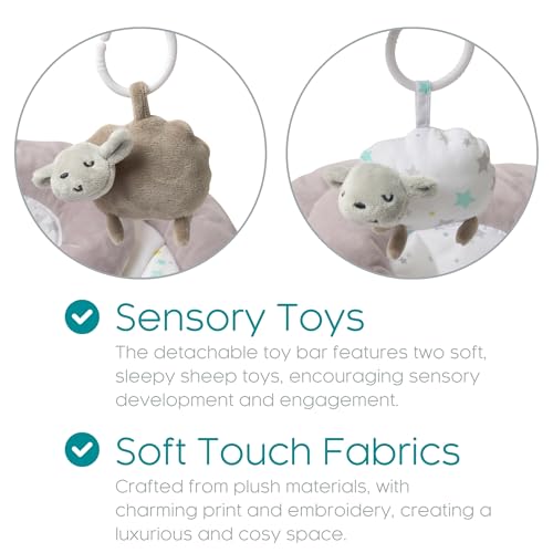- Removable toy bar with two sleepy sheep toys: The detachable toy bar features two soft, sleepy sheep toys, encouraging sensory development.