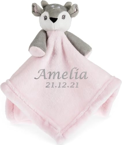 - Personalised Blanket – The pink deer comforter is personalised in silver embroidery with the name of your choice as shown (max 2 words) these make great keepsake toys a lovely personalised baby girl gift which will be treasured for many years. suitable from birth.