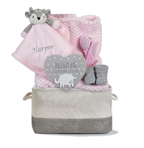 Personalised Baby Gift Hamper for Girls Pink Gift Hamper Newborn Embroidered Deer Comforter Shower Special Unique Nappy Caddy Gift Se