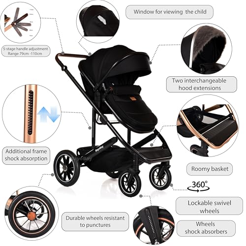 - ● ✅TWO HOOD EXTENSION STYLES.PLAIN AND FUR-LINED✅FIVE-STAGE HANDLE ADJUSTMENT✅ RUBBER WHEELS (NOT EVA-plastic), puncture-proof, all-terrain ✅MOMMY BAG ✅RAIN COVER ✅ BOTTLE HOLDER ✅ADJUSTABLE ECO-LEATHER HANDLE (suitable for caregivers between 155-190 cm high) ✅WIDE ENHANCED FRAME ✅ 3D SHOCK ABSORPTION.MULTIFUNCTION STROLLER. The infant stroller can also serve as a toddler seat stroller. The sleeping bassinet can be adjusted into a seat position. Baby sits upright or semi-reclined. The convertible stroller allows a baby to face either their parents or the outdoor scene.