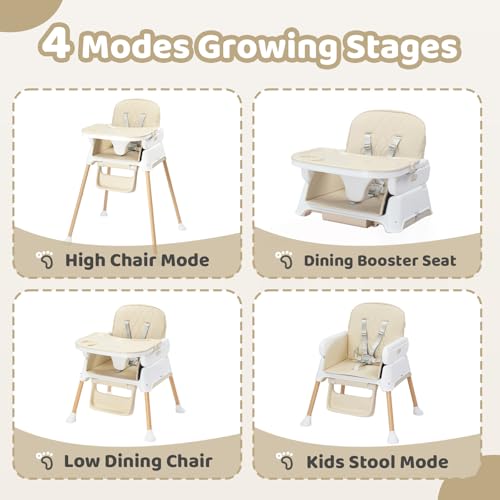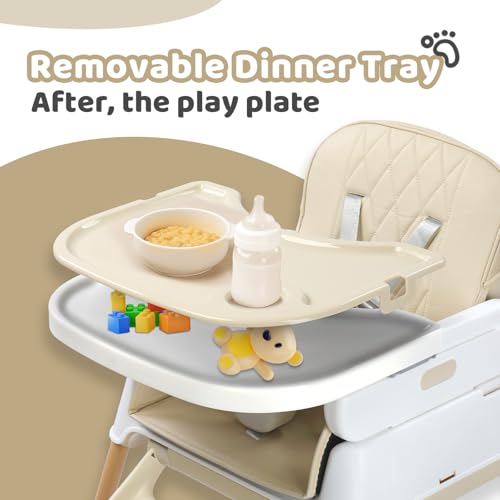 Bonnlo 3-in-1 Foldable Baby High Chair, Adjustable Height with Detachable Tray, 5-Point Safety Harness, Highchair for Toddlers 6 to 36 Months, Beige (Beige)