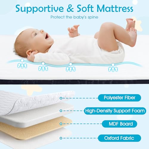 - 【Quality & Safe Construction】The soft and supportive mattress is made of polyester fiber, high-density support foam, MDF board, and Oxford fabric, which is able to protect the baby’s spine. The breathable mesh cloth on both sides not only ensures optimal air circulation but also lets you keep an eye on your little one.