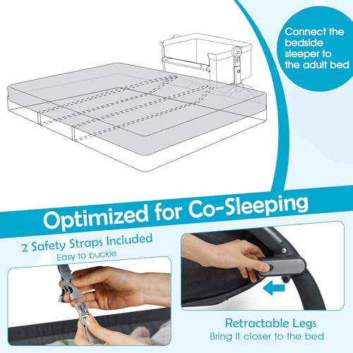 - 【Optimized for Co-Sleeping】You can connect the bedside sleeper to the adult bed with 2 safety straps included. Its retractable legs bring it closer to the bed, and an easily accessible side mesh panel fosters interaction and simplifies nighttime care.