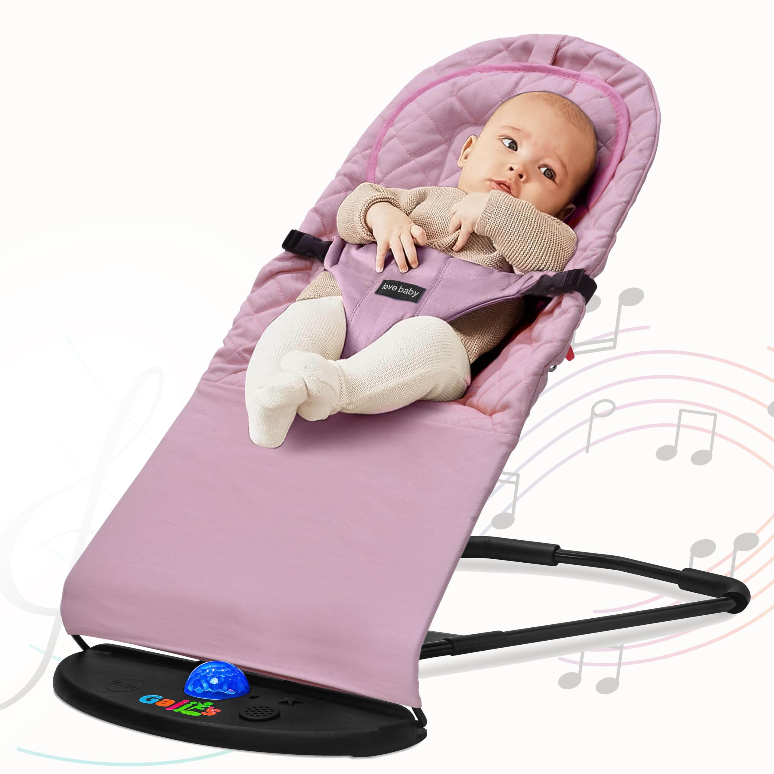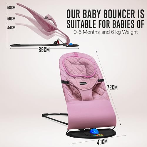 FK Sports Foldable Baby Bouncer, Adjustable Baby Bouncer Chair for Indoor & Outdoor Use, 3 Recline Positions, Includes Light, Music & Neck Pillow, for Babies 0–6 Months, Up to 6kg (Pink)