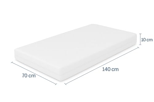 - Product Specifications: Size: 140 x 70 x 10 cm (standard UK cot bed size),Core: High-density eco fibre (recyclable, firm support), Weight: Approx. 2.5 kg