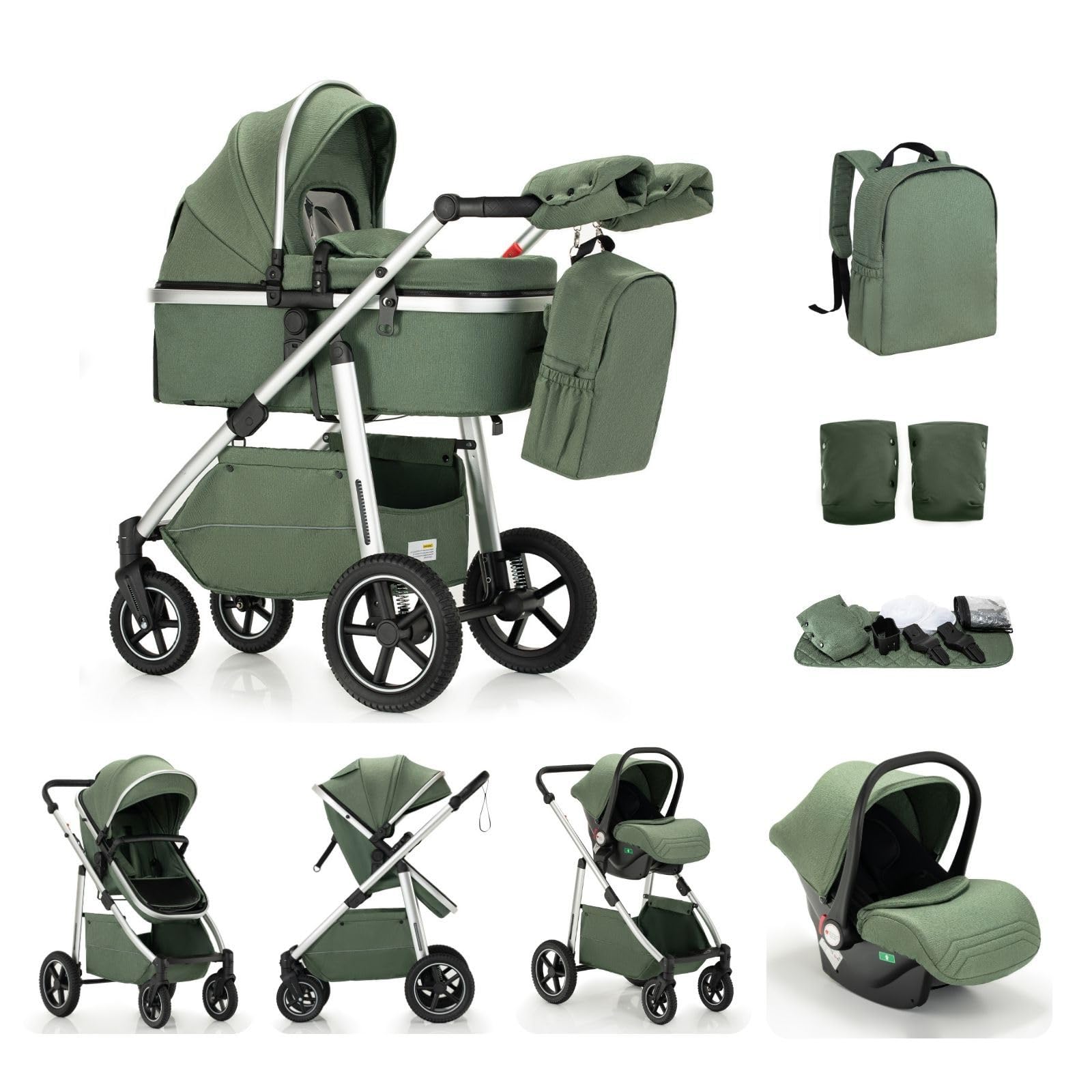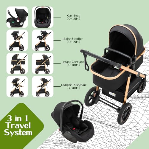 Kakbgee Baby Stroller 3 in 1, City Pram Travel System, Pushchair Height Adjustable Handle, Baby Buggy, Carrycot & Car Seat, Mosquito Net, High Landscape Aluminium Frame Pram for Newborn, 22KG, Gree