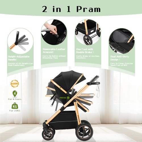 - 【2 in 1 Pram for 0-48M】This pram is convertible Infant Carriage (0-15M) and Toddler Pushchair (7-48M), suitable for newborn to toddler. The baby sleeping basket backrest is adjustable in 3 angles: deep sleep mode, anti-spit-up mode and sitting mode. Bassinet anti-collision handle can be opened, easy to pick up the baby without disturbing the baby