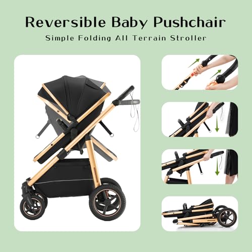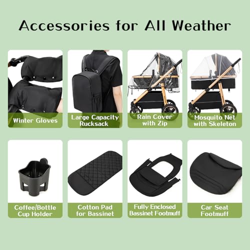 - 【Reversible High-View Stroller for All Seasons, Height Adjustable Handle】Awnings and sleeping baskets have vents, and the canopy can be detached to ventilate the baby in summer and cool down; Cotton Sleeping Basket can protect baby from the cold in winter. The high seat of the pram can keep the baby away from car exhaust and dust. The direction of the stroller is reversible, allowing baby to both observe the world and also interact with their parents