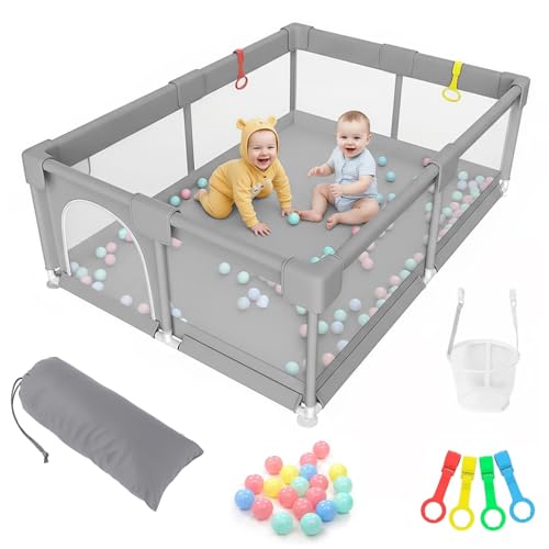 Baby Playpen, Large Safety Play Area, with Anti-Collision Foam Barrier with Breathable Mesh, Includes Ocean Balls and Pull Rings