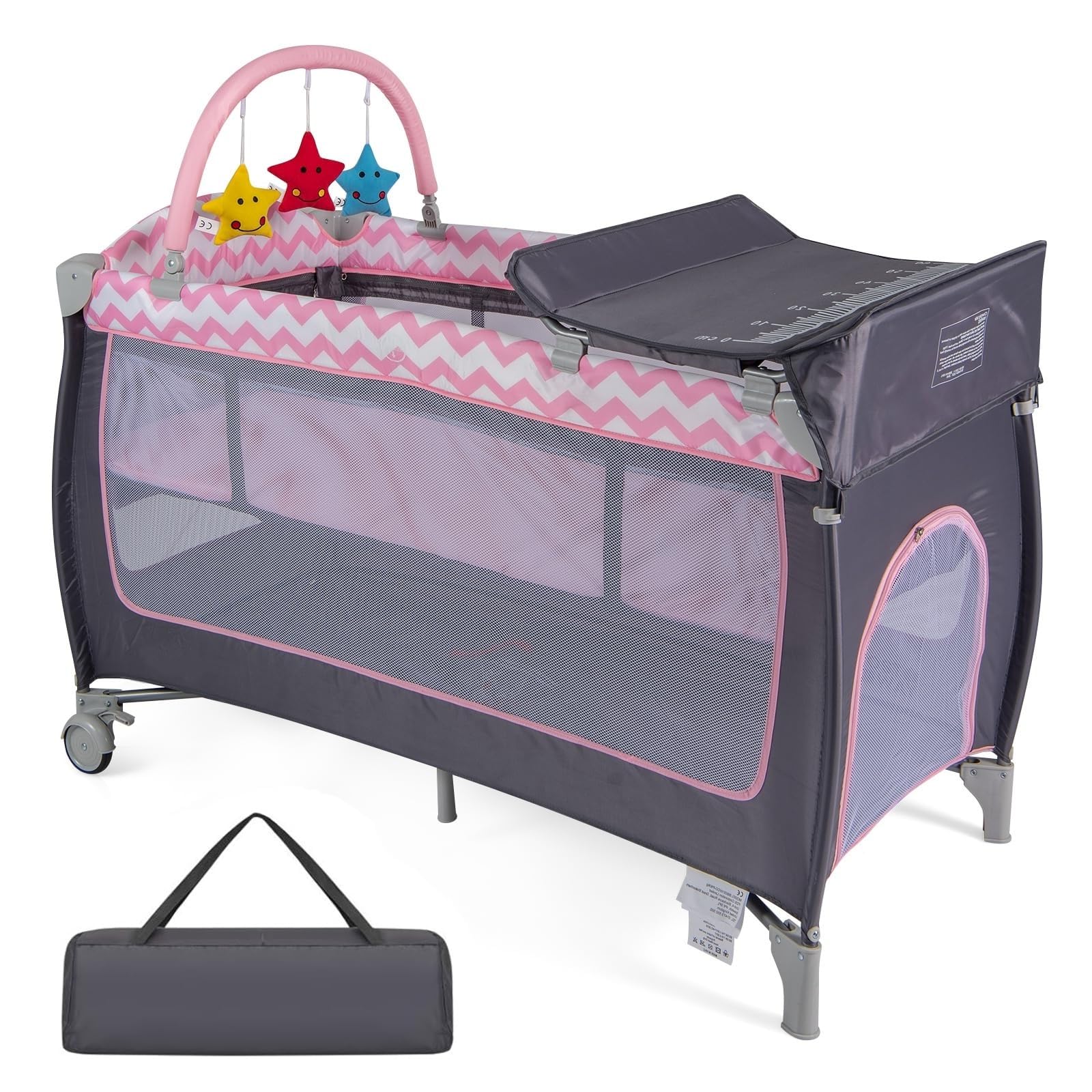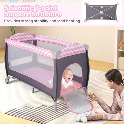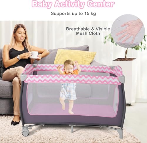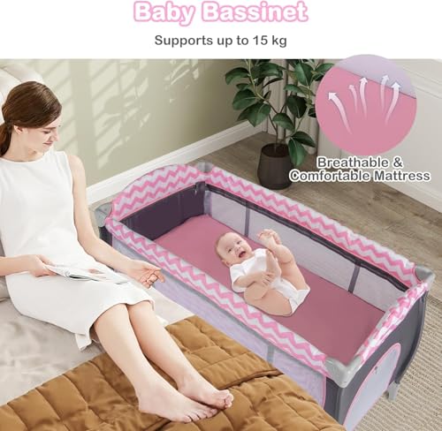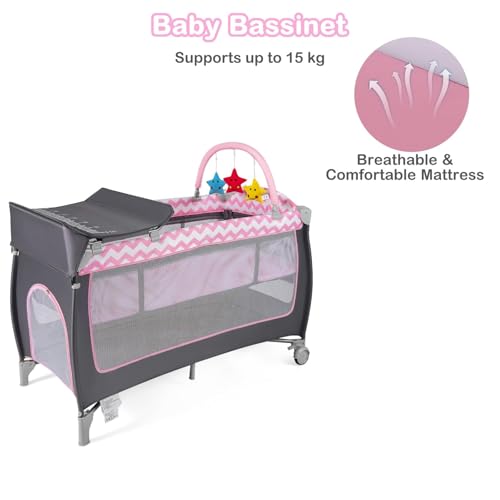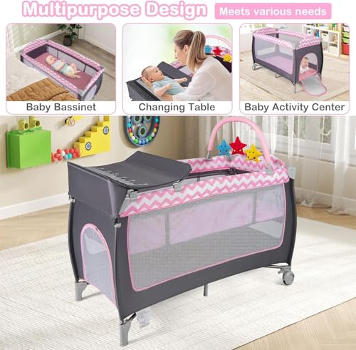 Baby Travel Cot, 4 in 1 Foldable Bedside Sleeper with Bassinet Diaper Changer Mattress Lockable Wheels 3 Hanging Toys Carry Bag, Crib Playard Pack and Play for Newborn Infant Toddler (Pink)