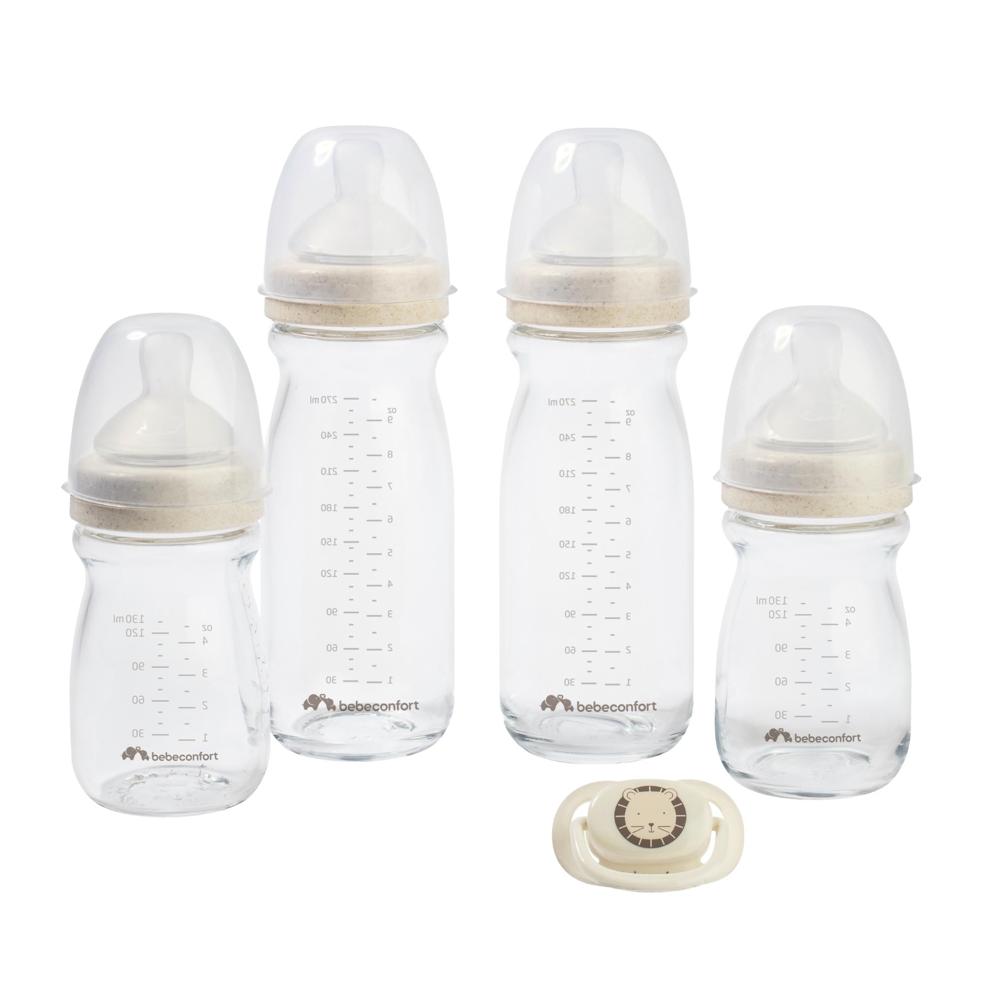 - ANTI COLIC BABY BOTTLES NEWBORN KIT: the set includes 4 glass feeding bottles (2x 130ml, 2x 270ml), a soother and 2 teats tailored to your baby's age