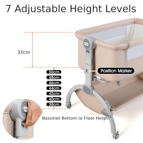 - 7-level Height Adjustment: The baby crib's dual-locking mechanism (press the bottom button + lift the top) adapts to different bed heights. Ergonomic design ensures perfect alignment with the parents' mattress, preventing the baby from falling, and allows easy access to the baby with one hand.
