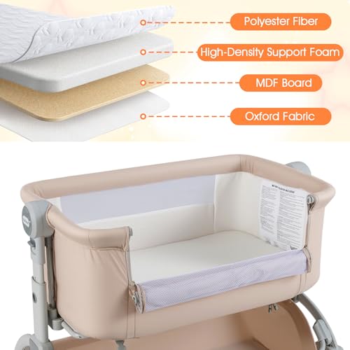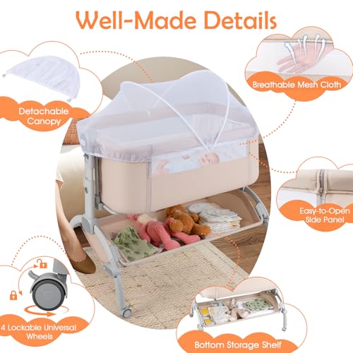 Maxmass Baby Crib, Infant Bedside Sleeper with Mattress, Mosquito Net, 7-Height Adjustment, Lockable Wheels & Storage Basket, Portable Newborn Cot for 0-6 Months (Beige)