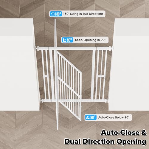 - 【One-Hand Lock & Auto-Close Door】Equipped with an upgraded lock for easy one-handed operation, allowing hands-free passage while holding pets or items. The dual-swing door automatically closes when opened less than 90° and stays open at 90°, combining convenience with reliable pet containment. Ideal as an indoor pet gate, cat safety gate, or dog gate for doorways.