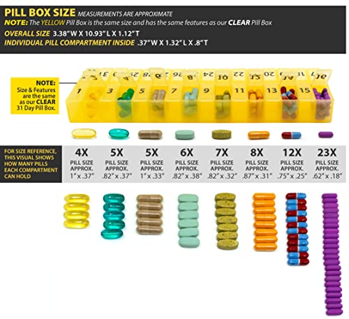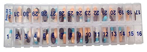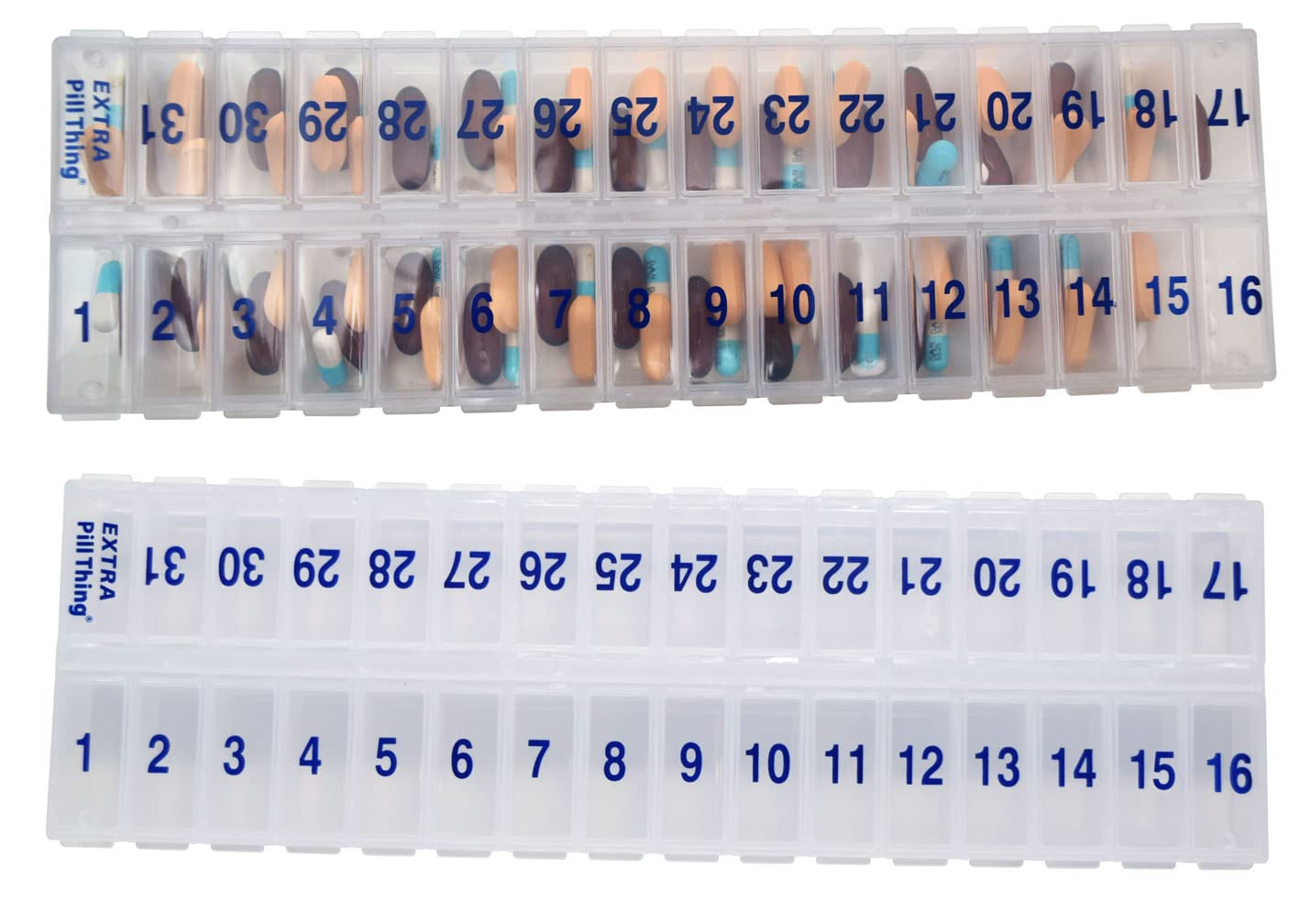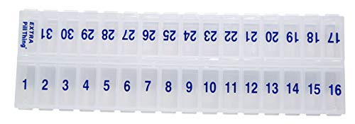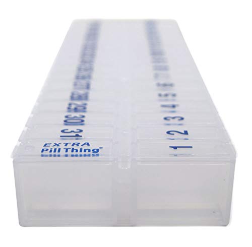As one of our most popular pill organizers, this easy to use portable case holds an entire month’s worth of medication. A MONTHS WORTH OF PILLS NEATLY ORGANIZED Keep 31 days of your medications in this monthly pill box plus it has a compartment for an EXTRA days worth of pills or for pills you take occasionally. REMOVABLE LID FOR EASY LOADING The entire set of numbered lids easily removes. The lids are connected so all lids remove from the bottom tray in one piece. Just open 5 lids on one end then gently grab them all at once and lift – the entire lid section will remove easily. With the lid section removed it is easy to load your month’s medications. To replace the lid section line up the middle track then gently press down from the center working towards the edges. LARGE PRINT & EASY TO UNDERSTAND Each lid has the day of the month 1 – 31 printed in large, easy to read print. The numbered lids correspond to the day of the month that you are on so you know which pills you should be taking. This makes it easy for individuals and caregivers to manage the entire month. Plus the box is translucent so you can easily see if the days medications have been taken. START SAVING TIME & MONEY TODAY Organize your medications one time a month instead of opening several containers every day. And Save Money by buying your supplements and vitamins in bulk and organize an entire month’s supply at one time.