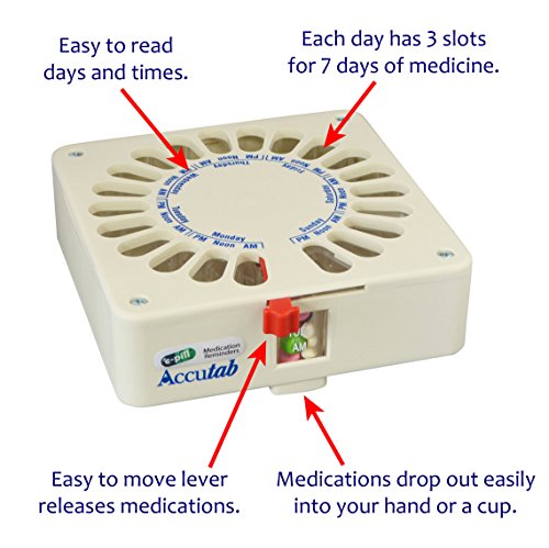 :Accutab takes the work out of organising weekly medications. It’s an innovation in medication control, making hard to open bottles and awkward plastic pillboxes a thing of the past. Accutab simplifies the task of planning for multiple doses of several medications and dispenses the correct dose with ease. The dispenser can be loaded weekly by an individual or care giver, dramatically enhancing on-time, correct dosing of medications. Accutab is loaded once a week by the user or care giver. 21 compartments that are larger than most pill boxes. Can be mounted under or in cabinet for convenience.