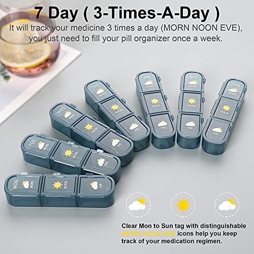 - Store Weekly Meds ( 3 Times A Day ) — This elegant 7 day pill organizer will track your medicine 3 times a day (morning, noon, evening) and the icons of 7 day pill box will make your pills or refills very easy to retrieve, you just need to fill the pill organizer once a week! You will love the functionality of being able to take your daily pills with you when you are traveling, or daily outing