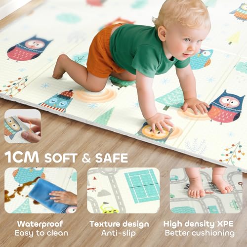 AIYAPLAY Baby Play Mat Double-Sided, Foldable and Waterproof Large Foam Playmat, Reversible Kids Floor Mat for Crawling, Learning and Development, 195.5L x 147.5W cm, Car Track and Owl Theme