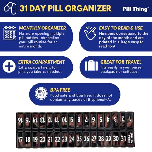 - Large Print & Easy To Understand – Each lid has the day of the month 1 – 31 printed in large, easy to read print. The numbered lids correspond to the day of the month that you are on so you know which pills you should be taking. This makes it easy for individuals and caregivers to manage the entire month. Plus the box is translucent so you can easily see if the days medications have been taken.