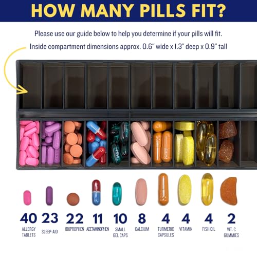 - Great Size – Our monthly pill organizer can hold several medications in each individual day compartment. Please refer to our graphic showing different size medications and how many can fit in on compartment. The diagram features our yellow pill holder but it’s size is the same as our clear pill holder.