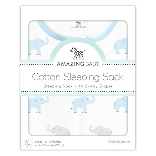 Amazing Baby Cotton Sleeping Sack with 2-Way Zipper, Tiny Elephants, Pastel Blue, Small, 0-6 Months