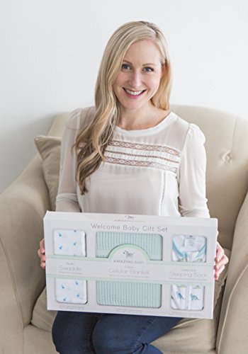 - 3-piece gift set includes: (1) cotton muslin swaddling blanket, (1) cotton cellular blanket, and (1) cotton knit sleeping sack
