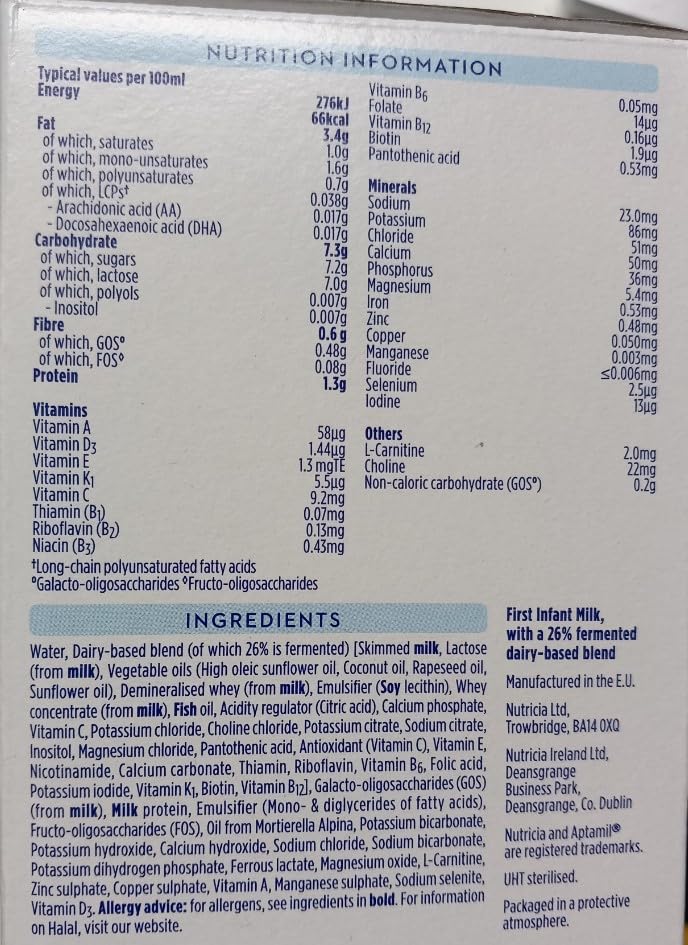 Ingredients: Water, Dairy-based Blend (of Which 26% is Fermented) [Skimmed MILK, Lactose (from MILK), Vegetable Oils (High Oleic Sunflower Oil, Coconut Oil, Rapeseed Oil, Sunflower Oil), Demineralised Whey (from MILK), Emulsifier (SOY Lecithin), Whey Concentrate (from MILK), FISH Oil, Acidity Regulator (Citric Acid), Calcium Phosphate, Vitamin C, Potassium Chloride, Choline Chloride, Potassium Citrate, Sodium Citrate, Inositol, Magnesium Chloride, Pantothenic Acid, Antioxidant (Vitamin C), Vitamin E, Nicotinamide, Calcium Carbonate, Thiamin, Riboflavin, Vitamin B6, Folic Acid, Potassium Iodide, Vitamin K₁, Biotin, Vitamin B12], Galacto-Oligosaccharides (GOS) (from MILK), MILK Protein, Emulsifier (Mono- & Diglycerides of Fatty Acids), Fructo-Oligosaccharides (FOS), Oil From Mortierella Alpina, Potassium Bicarbonate, Potassium Hydroxide, Calcium Hydroxide, Sodium Chloride, Sodium Bicarbonate, Potassium Dihydrogen Phosphate, Ferrous Lactate, Magnesium Oxide, L-Carnitine, Zinc Sulphate, Copper Sulphate, Vitamin A, Manganese Sulphate, Sodium Selenite, Vitamin D3
