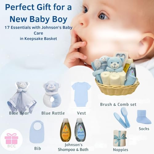 Baby Boy Hamper Gift – 17 Baby Essentials with Johnson’s Bath Products in Keepsake Rattan Basket Blue – Perfect Baby Boy Gifts Newborn Hamper & Thoughtful Gift Set for Baby Showers and New Parents