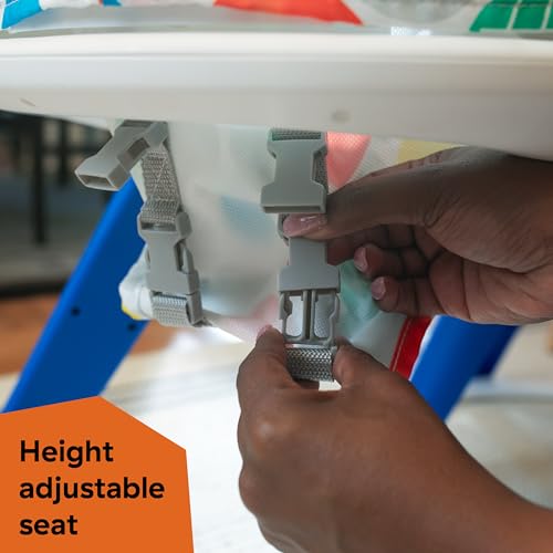 - 3-position height-adjustable seat travels 360° around the table, supporting baby’s first steps
