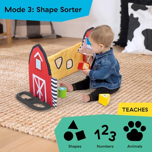 - Extra-large play mat with 4 modes: tummy time, activity gym, barn mode with shape sorter, and road play